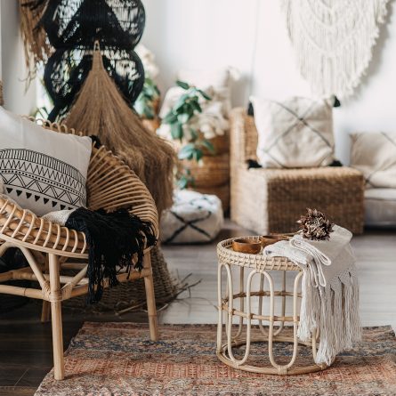 As fibras naturais também aumentam a sensação de conforto. Então, vale a pena investir em vime, palha, rattan, capim dourado, bambu, piaçava, sisal, corda, entre outros.